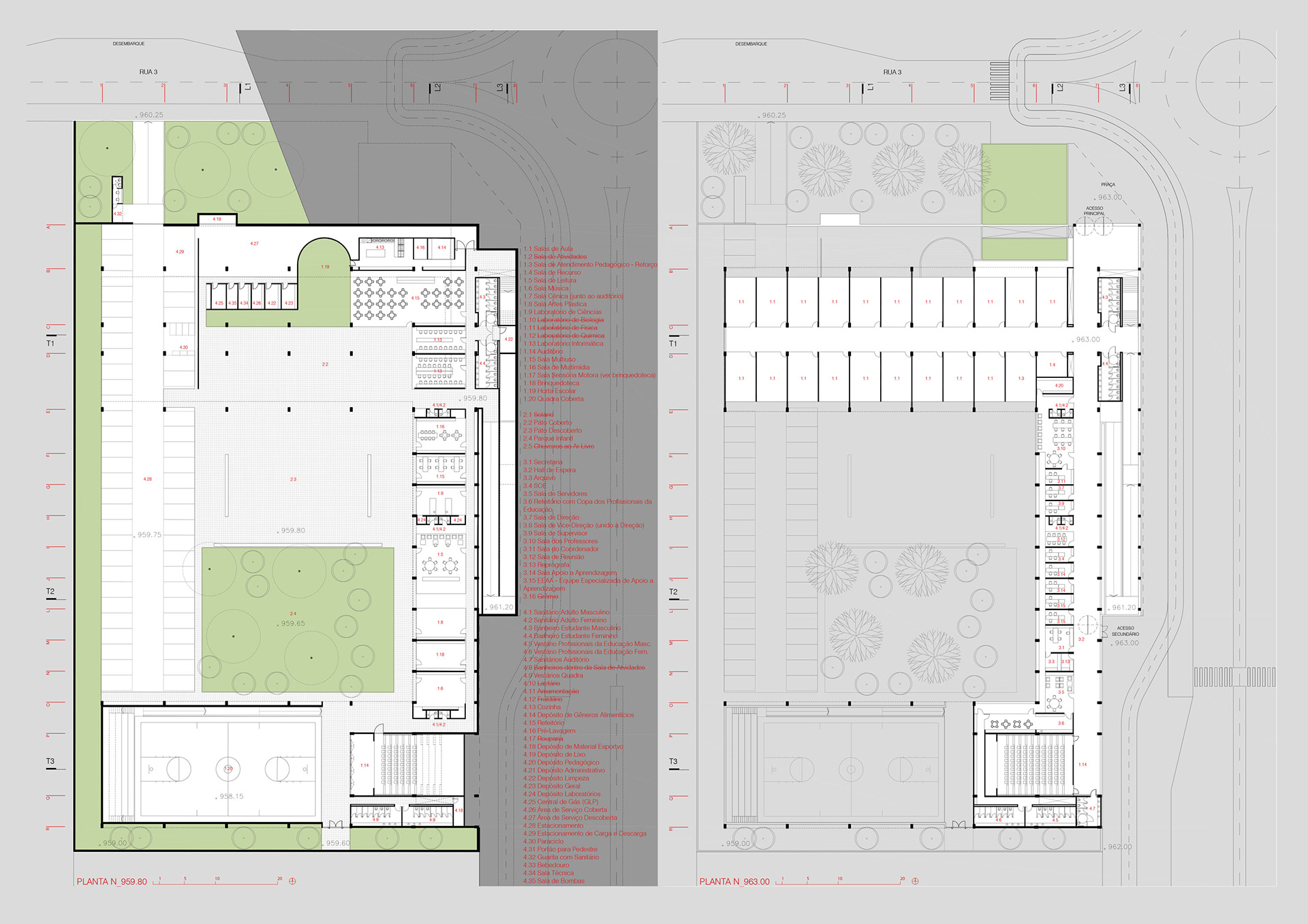 A leitura do programa sugere uma clareza projetual no que tange as grandes áreas. Assim se apresenta a distribuição espacial do edifício. A função pedagógica foi dividida. A parte destinada as salas de aula fica localizada logo no pavimento de entrada, otimizando a circulação dos alunos nos horários de pico. A parte das salas destinadas a um uso mais pontual, como do laboratório, brinquedoteca, multiuso etc., foram dispostas no pavimento inferior, de frente à “praça” (parque e pátio descoberto), remetendo o espaço às atividades extras e dinâmicas, onde tais salas podem se “estender” ao ambiente externo. Implantado ainda neste pavimento inferior a parte da função recreativa e do ginásio coberto, que fecha a grande praça central. A função de serviços completa o pavimento, locada de maneira estratégica perto do acesso do portão do estacionamento.