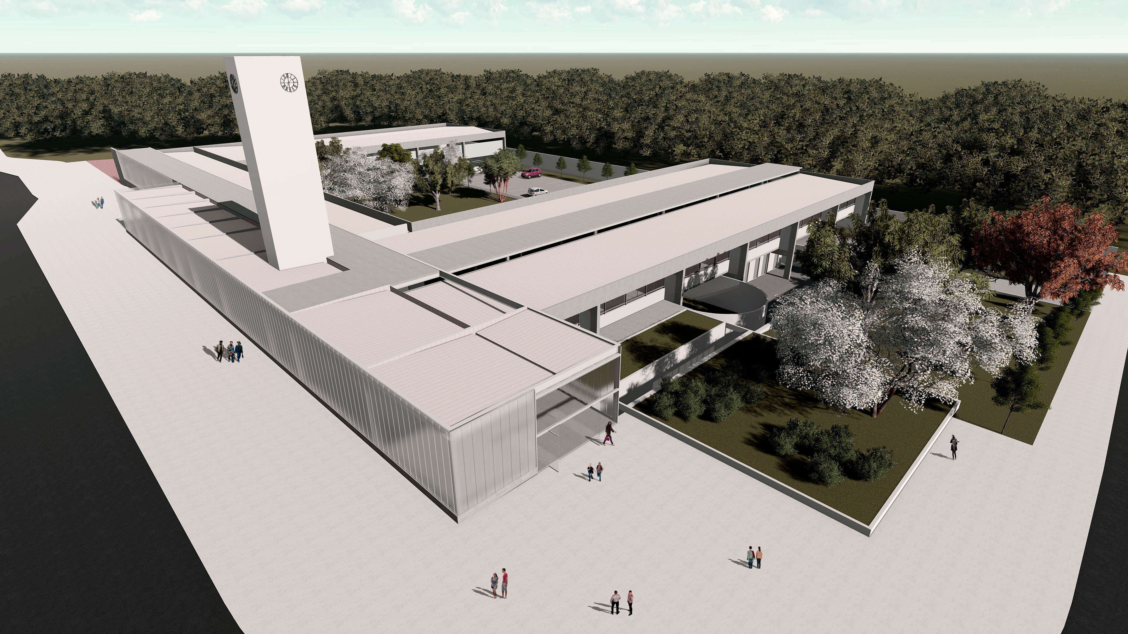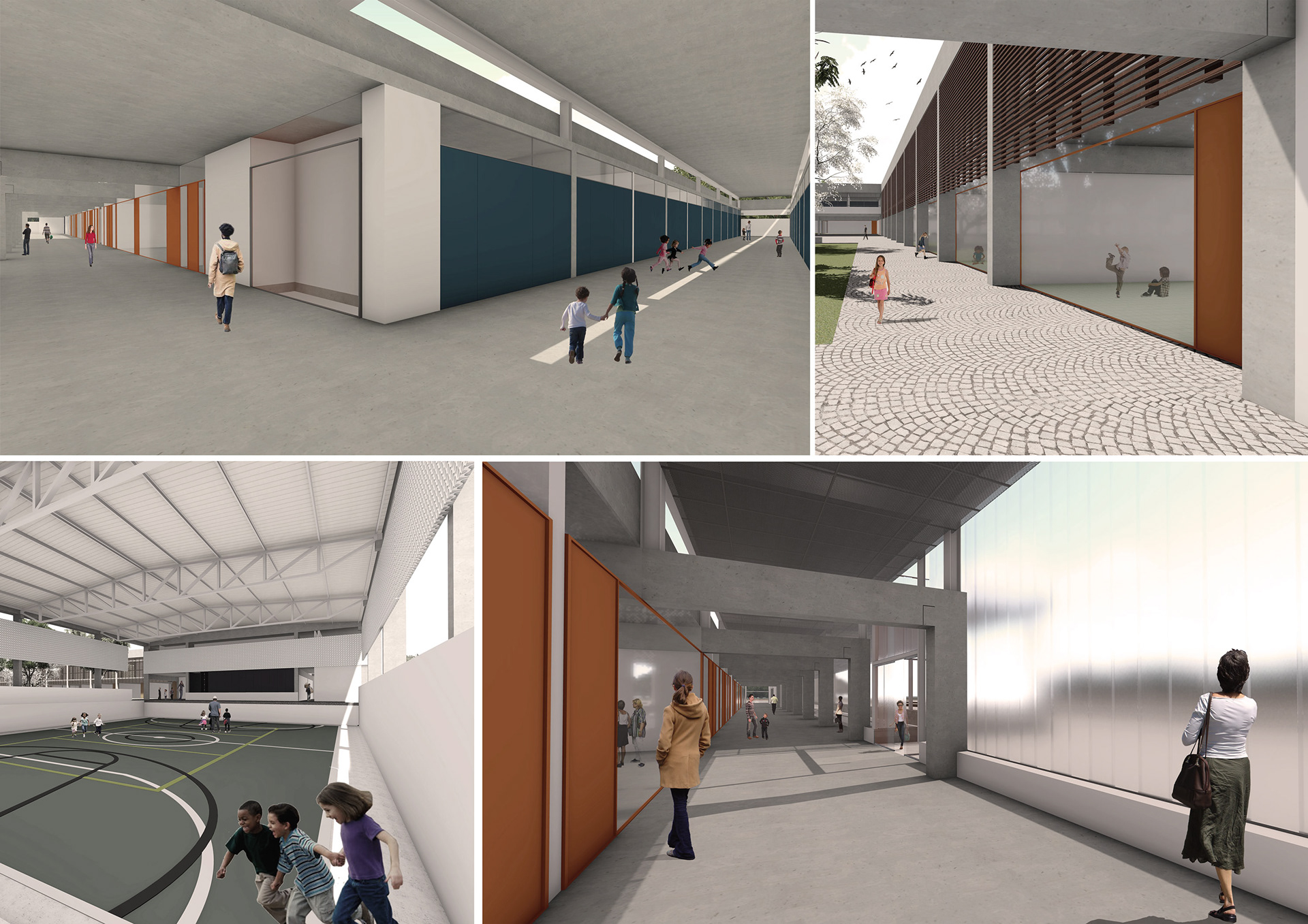A articulação entre as esferas pública e privada passa pela disposição da edificação próximo do limite do lote, potencializando o condensador social da escola com as boas práticas urbanas. O modelo passa a considerar o ponto de contato da cidade, o pavilhão conector das circulações, como o grande ponto de movimento do programa; uma espécie de prisma translúcido que ao mesmo tempo isola e remete ao exterior. A parte da concentração, da reclusão, fica ao pátio descoberto. Um amplo espaço abraçado pelos pavilhões da escola. Este é o momento do oásis, da liberdade aos rumores externos.