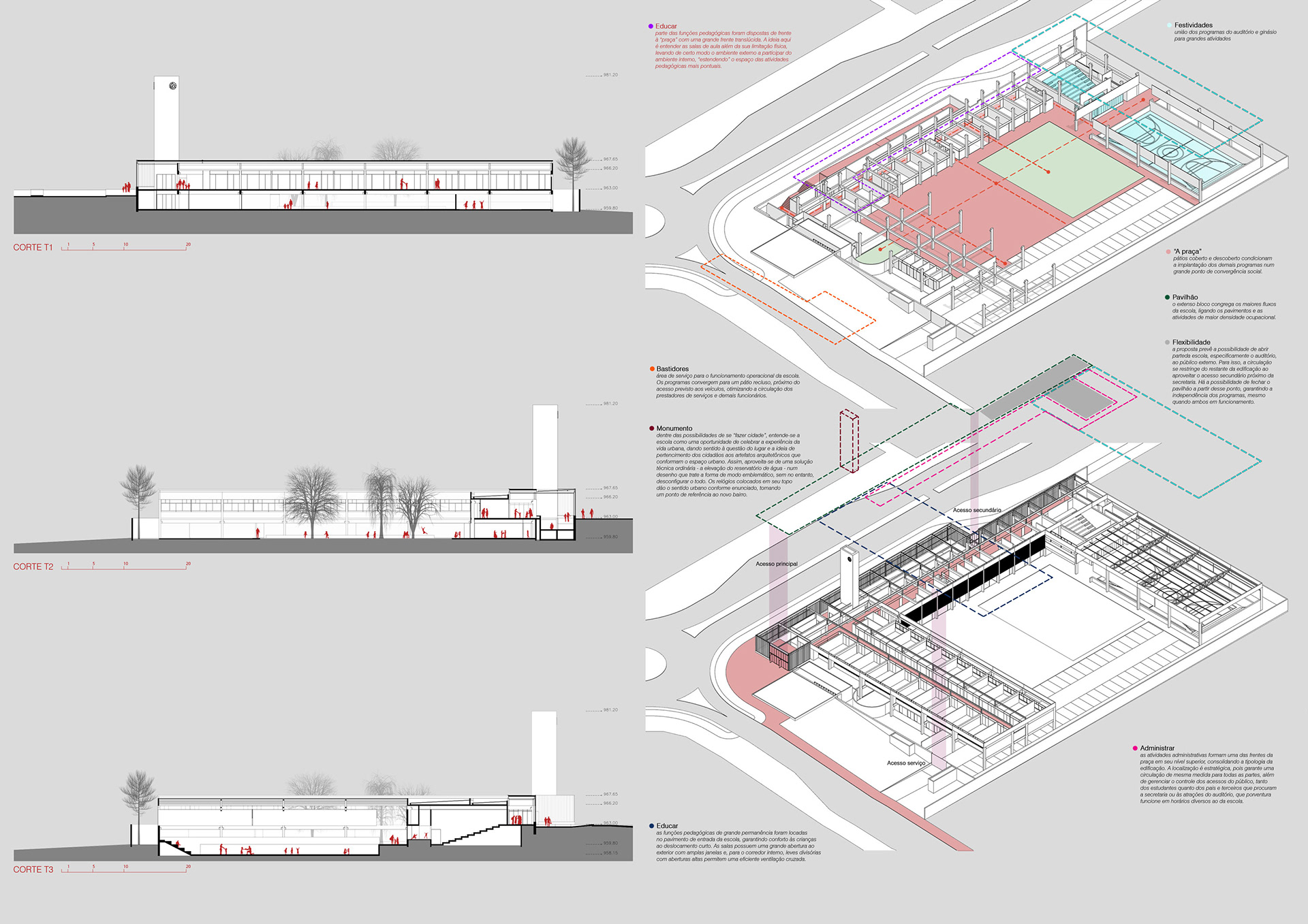 No pavimento de entrada, além das salas de aula já mencionadas se encontra o corpo do auditório da as funções administrativas, abrigadas pelo pavilhão que remete ao limite físico urbano. Um extenso eixo de circulação liga as partes, desde da entrada apoiada numa praça ao acesso do auditório. As salas da administração percorrem o eixo, tornando presença importante e clara ao funcionamento geral da escola. Os dois acessos inseridos preveem a máxima flexibilização da edificação à usos que vão além das atividades diárias escolares; como o caso do auditório que poderia vir a se abrir aos finais de semana para terceiros e outras requisições mais corriqueiras, como dos familiares e prestadores de serviços entrarem em contato com a secretaria. Este pavilhão coringa distribui e controla toda a circulação da escola, adequando o programa de necessidades de acordo com o partido arquitetônico de integração e reclusão urbana, intensidade e repouso.