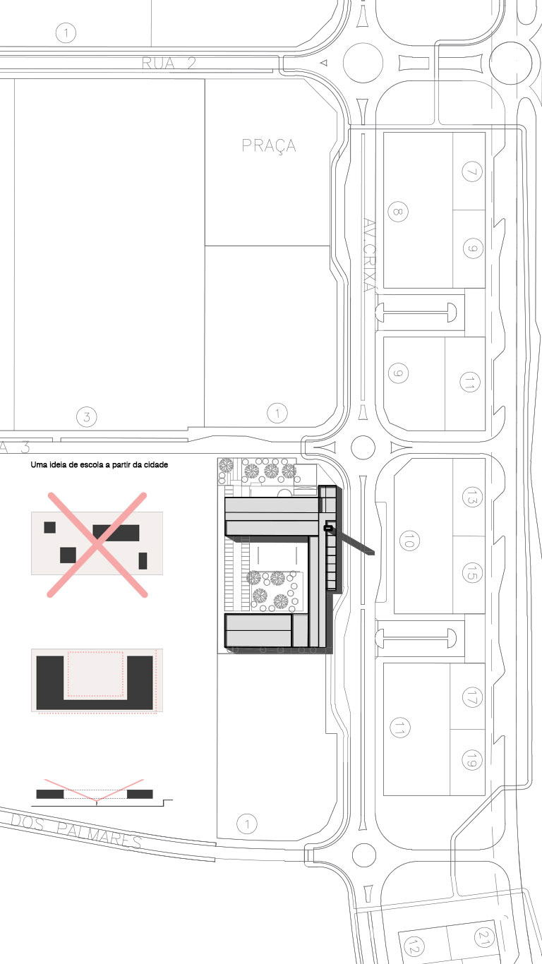 Diante dessa premissa, entendendo a escola a partir da cidade, nos coube a refletir sobre o programa da educação em arquitetura. Se por um lado o isolamento do ambiente escolar garante um espaço propício à concentração dos estudos, um oásis dentro da cidade, por outro desvincula-se muitas vezes da condição urbana do edifício.