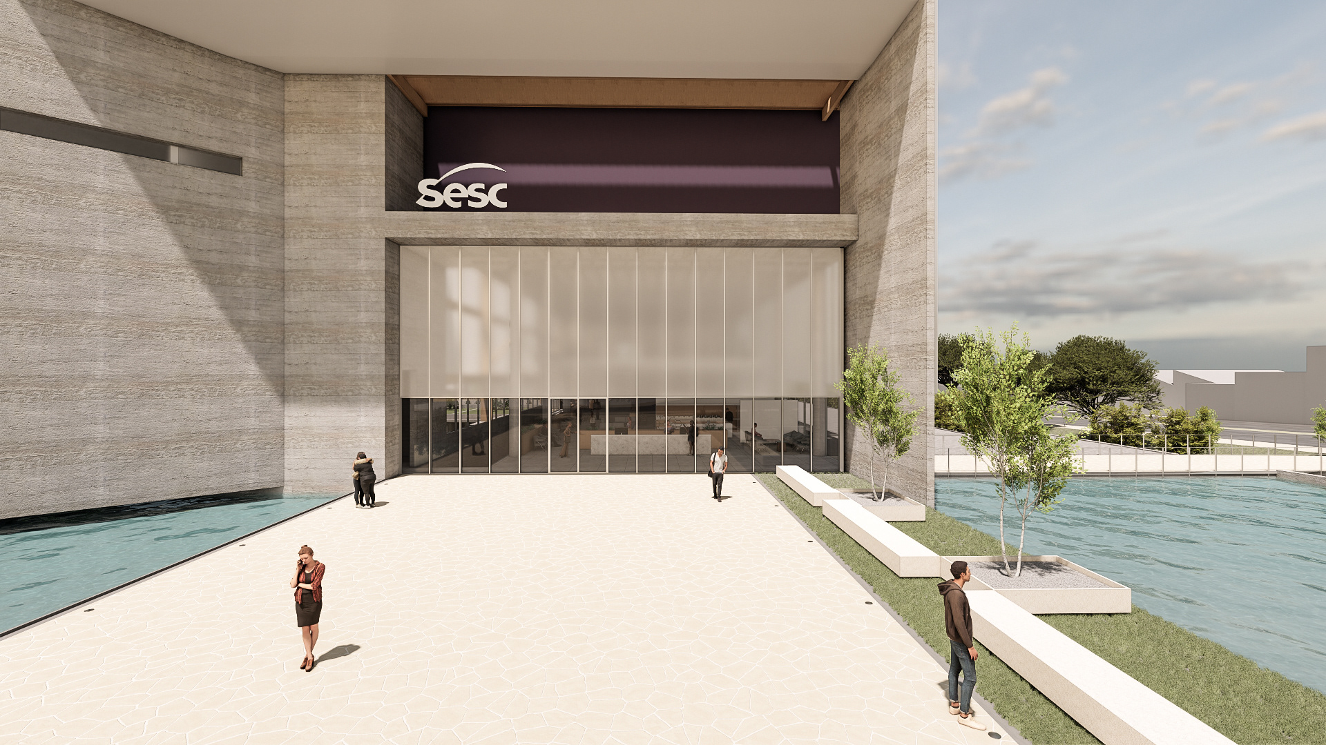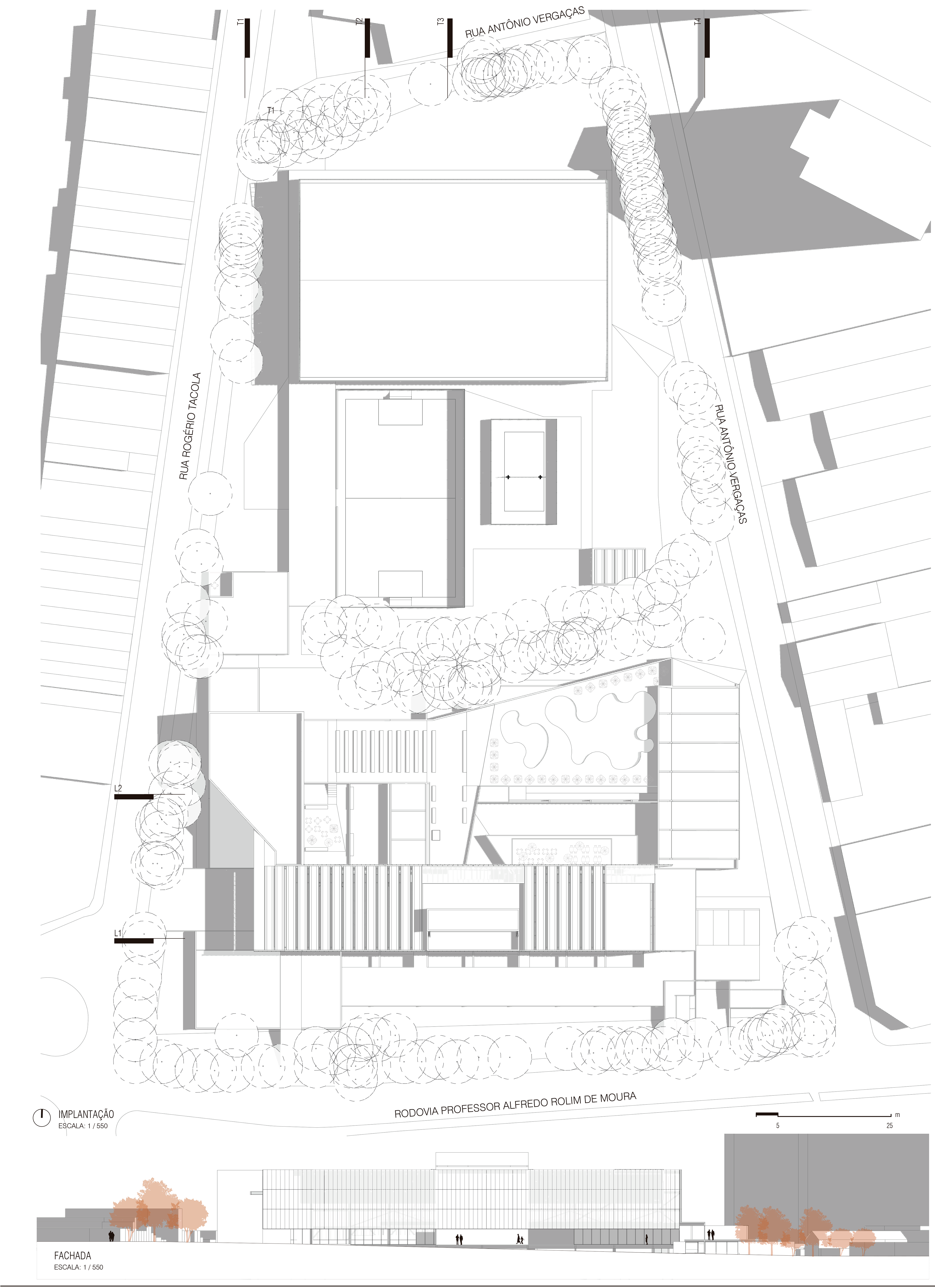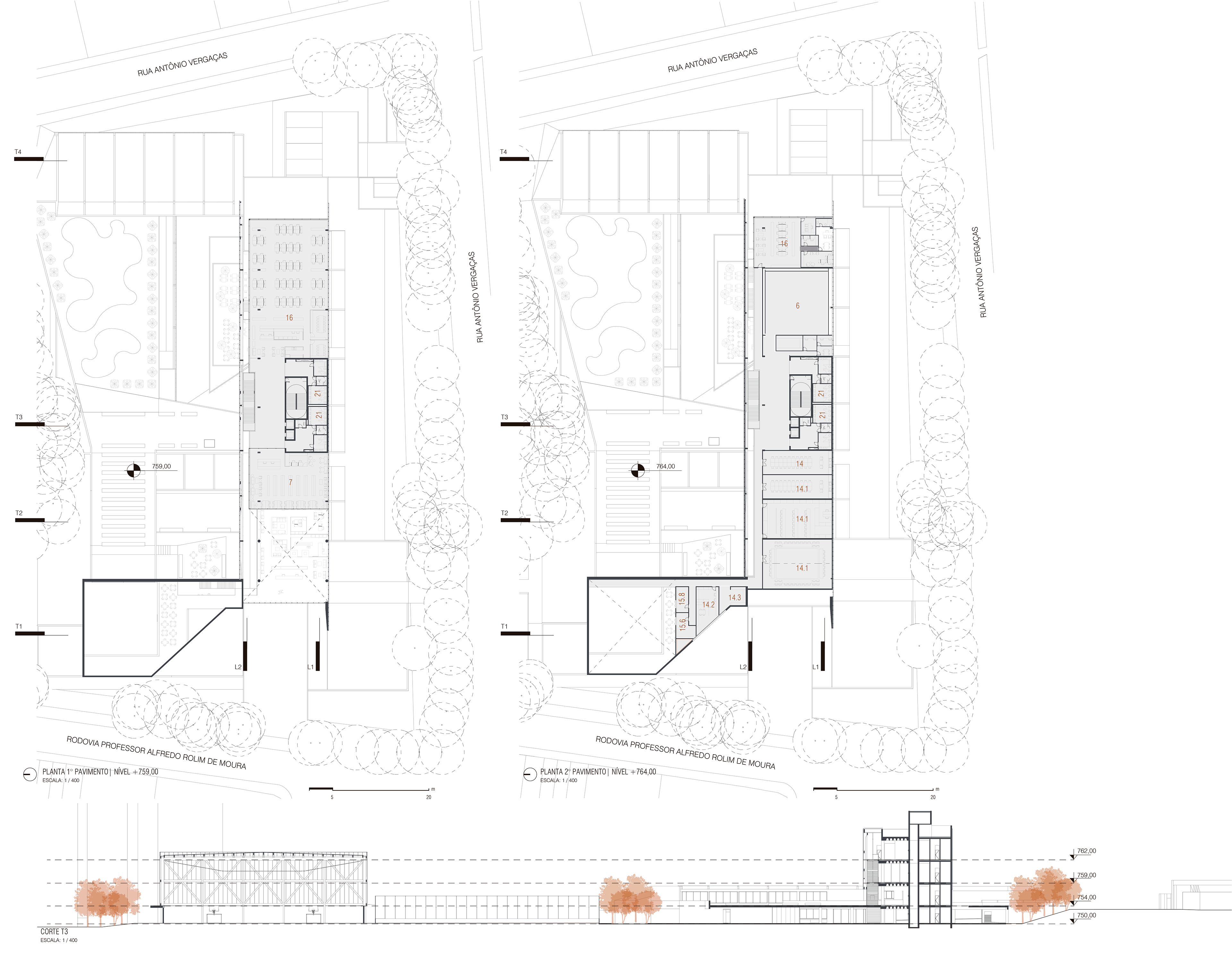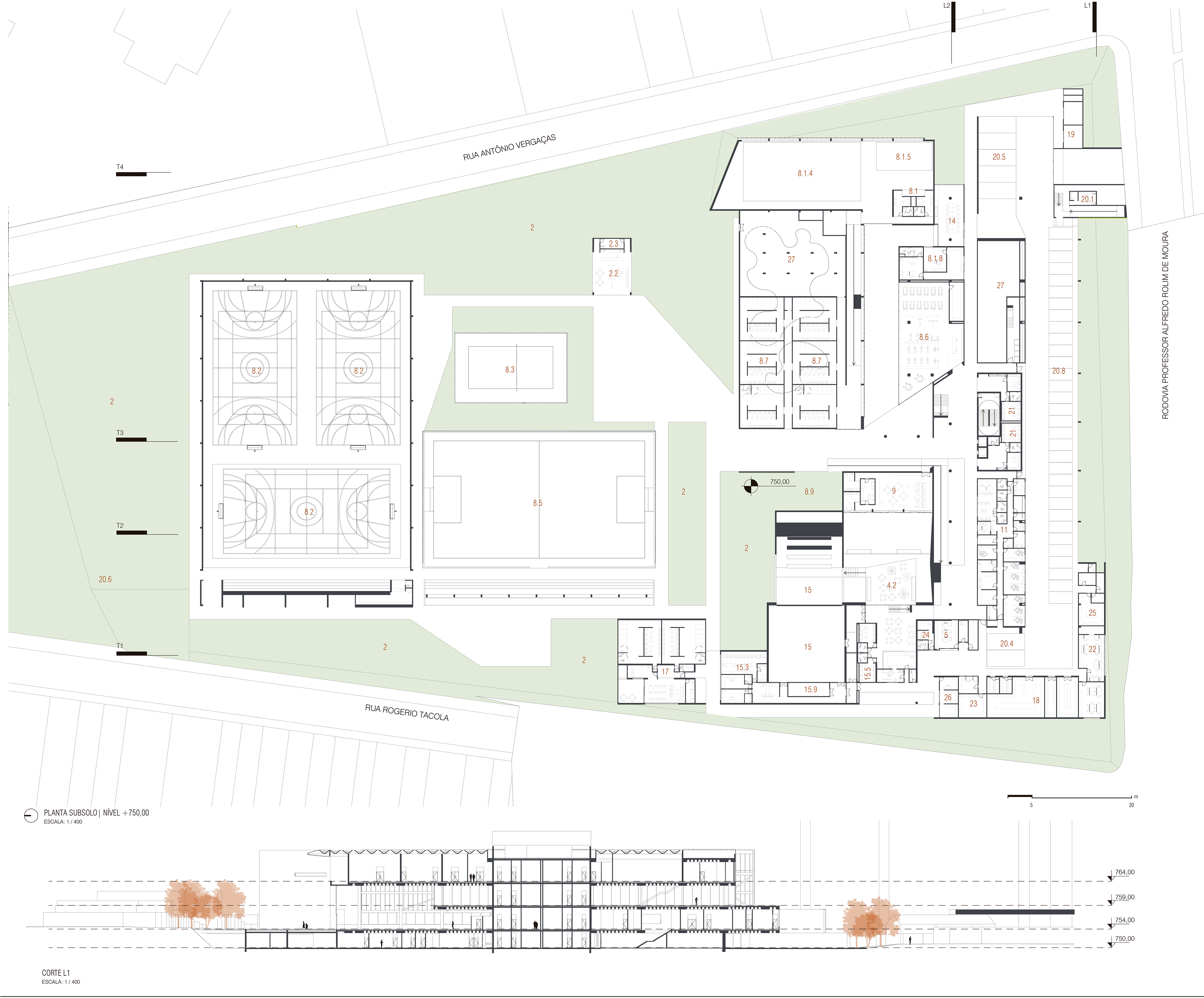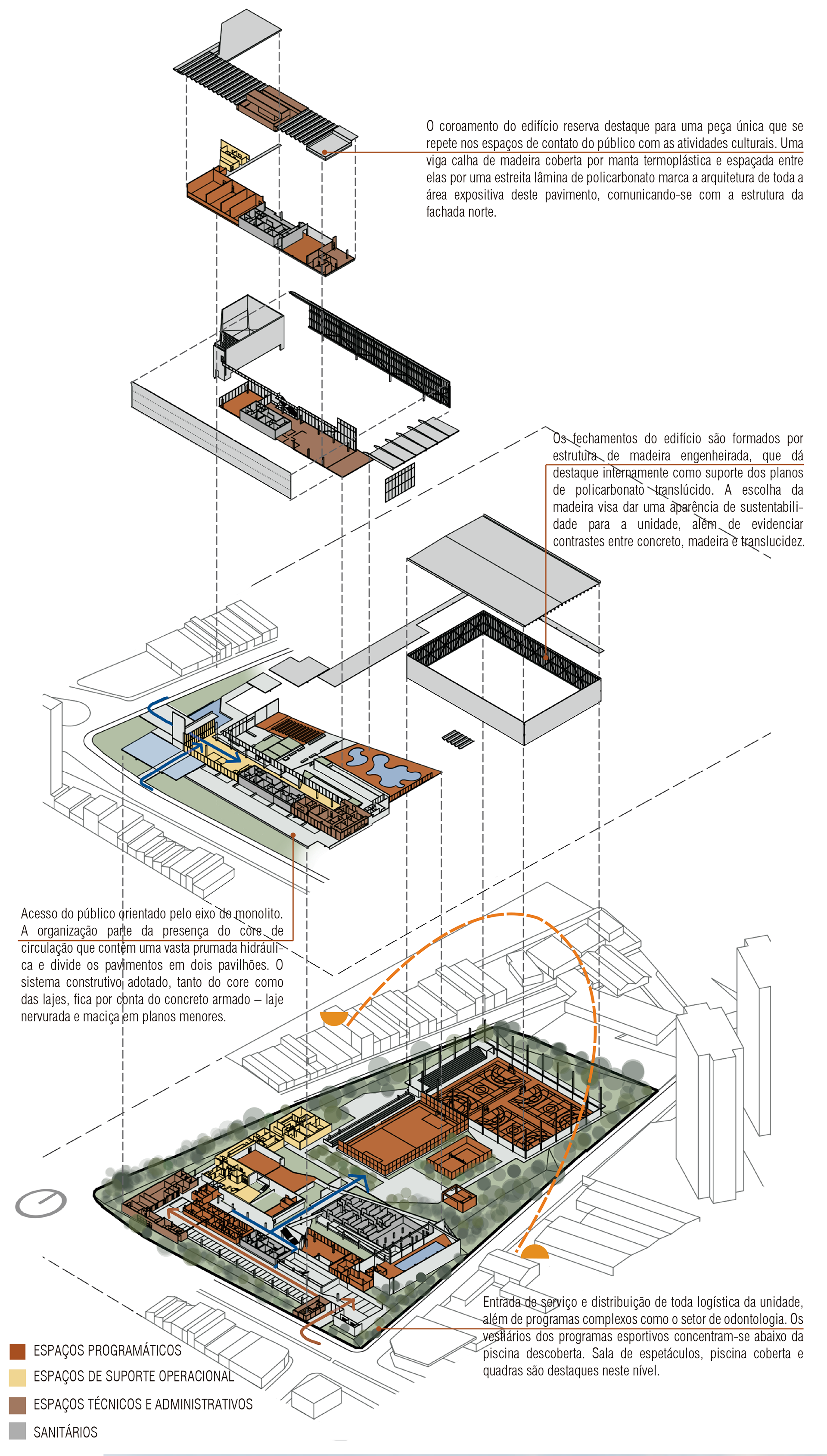 O desafio e o prazer de projetar edifícios vai além das complexidades imanentes do objeto arquitetônico. Pensar um edifício qualquer, sobretudo esta nova unidade SESC, é um dos modos mais importantes e pertinentes de se fazer cidade, revelando a natureza urbana dos edifícios institucionais da urbe. Neste sentido que a interpretação do programa procura salientar condições cotidianas dessa vital relação entre a parte e o todo, estimulando singelos discursos de uma urbanidade no nível cotidiano das apropriações do espaço do edifício. Como da transição suave entre o público e privado no acesso ao edifício, estimulando a presença de uma fachada ativa robusta, criando uma dinâmica visual que permite explorar perspectivas do lote para com a cidade. O cotidiano se descortina, interna e externamente, a partir do envelopamento translúcido do volume, sem a necessidade de uma ruptura abrupta entre as partes, denotando a fluidez interna da proposta e o convite do caminhar para o usuário. A cota 754 é a base do acesso do público. Grande parte do programa social e operacional é organizado a partir do eixo monolítico do edifício. A entrada reserva um espaço amplo e contínuo entre hall de acesso, loja, atendimento e convivência até a comedoria, reservada aos fundos do piso, de fronte às piscinas e à vista interna do lote. Nos pisos acima encontram-se os espaços mais reservados ao silêncio como a biblioteca, salas múltiplos usos, espaço de exposições e a administração. No piso inferior (750) fica toda a parte técnica de serviço, formando um extenso bastidor de funcionamento da unidade. Outro destaque além da face principal é o volume da sala de espetáculos que contrasta com a translucidez da pele perpendicular a sua robustez do concreto aparente. Esta peça concentra os olhares da unidade com a possibilidade de abertura daquela “rocha” para o exterior, promovendo apresentações diversas para o público. No restante do lote, os programas esportivos espalham-se no grande platô central, tendo as quadras cobertas como pano de fundo.