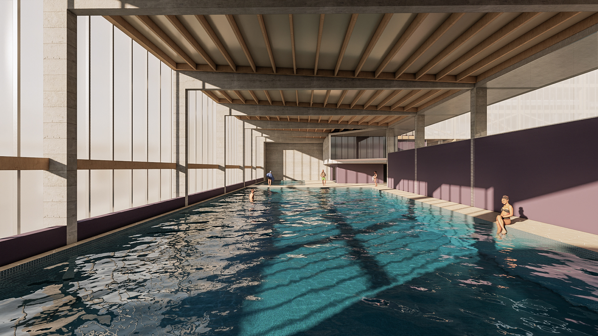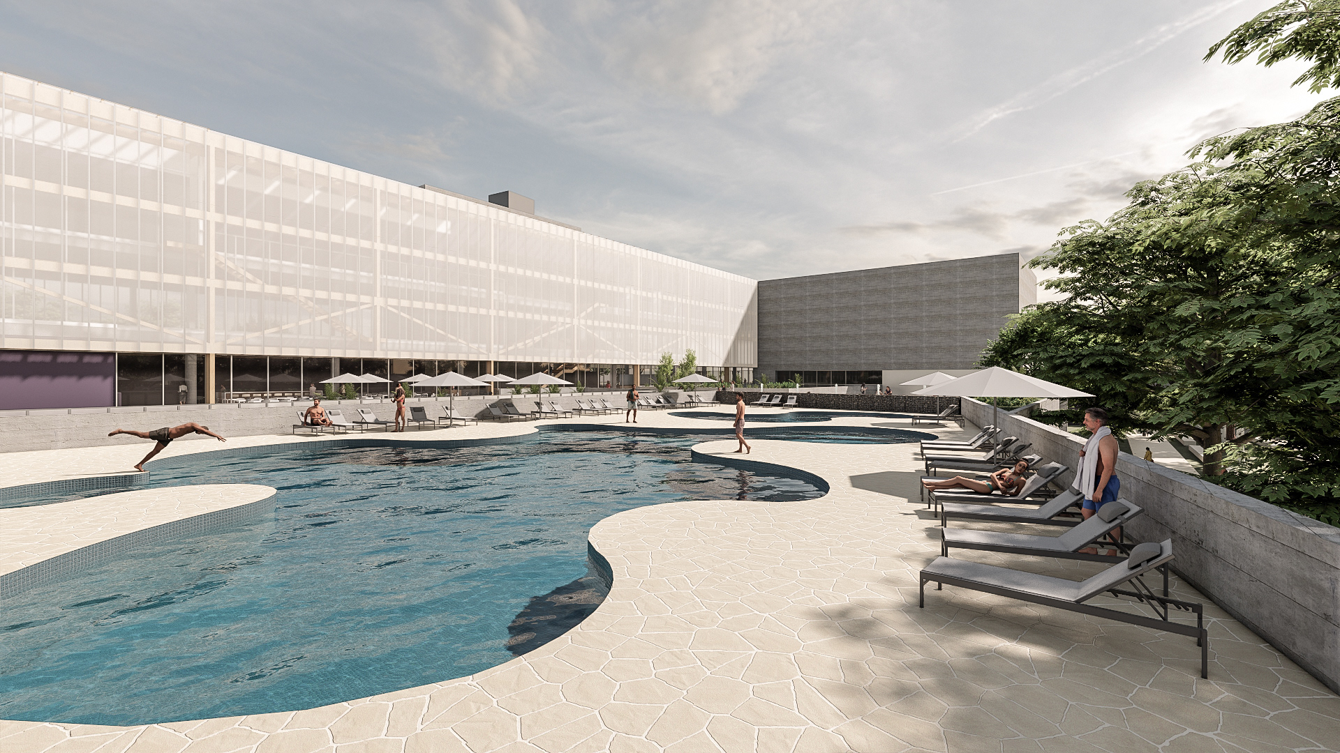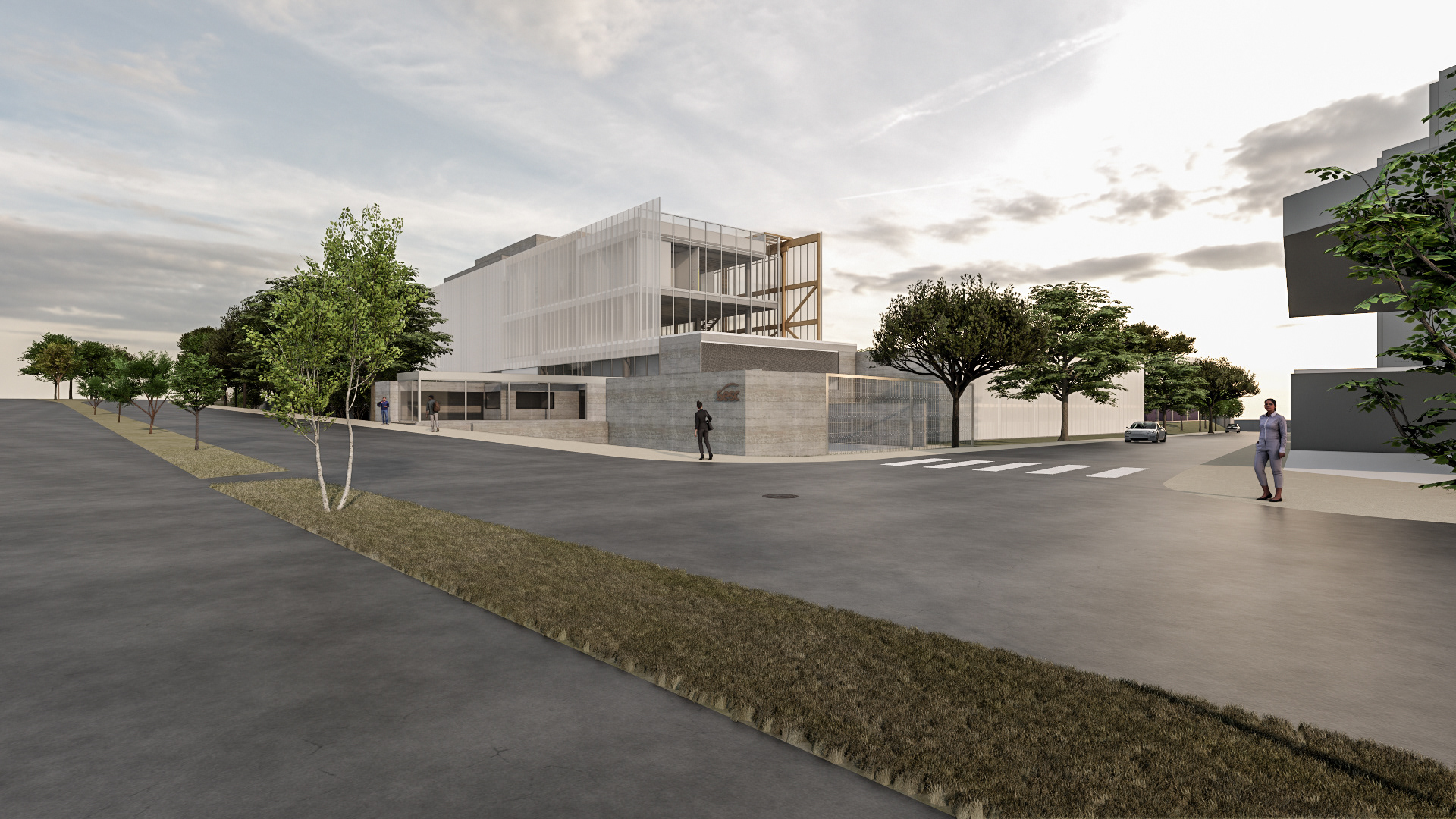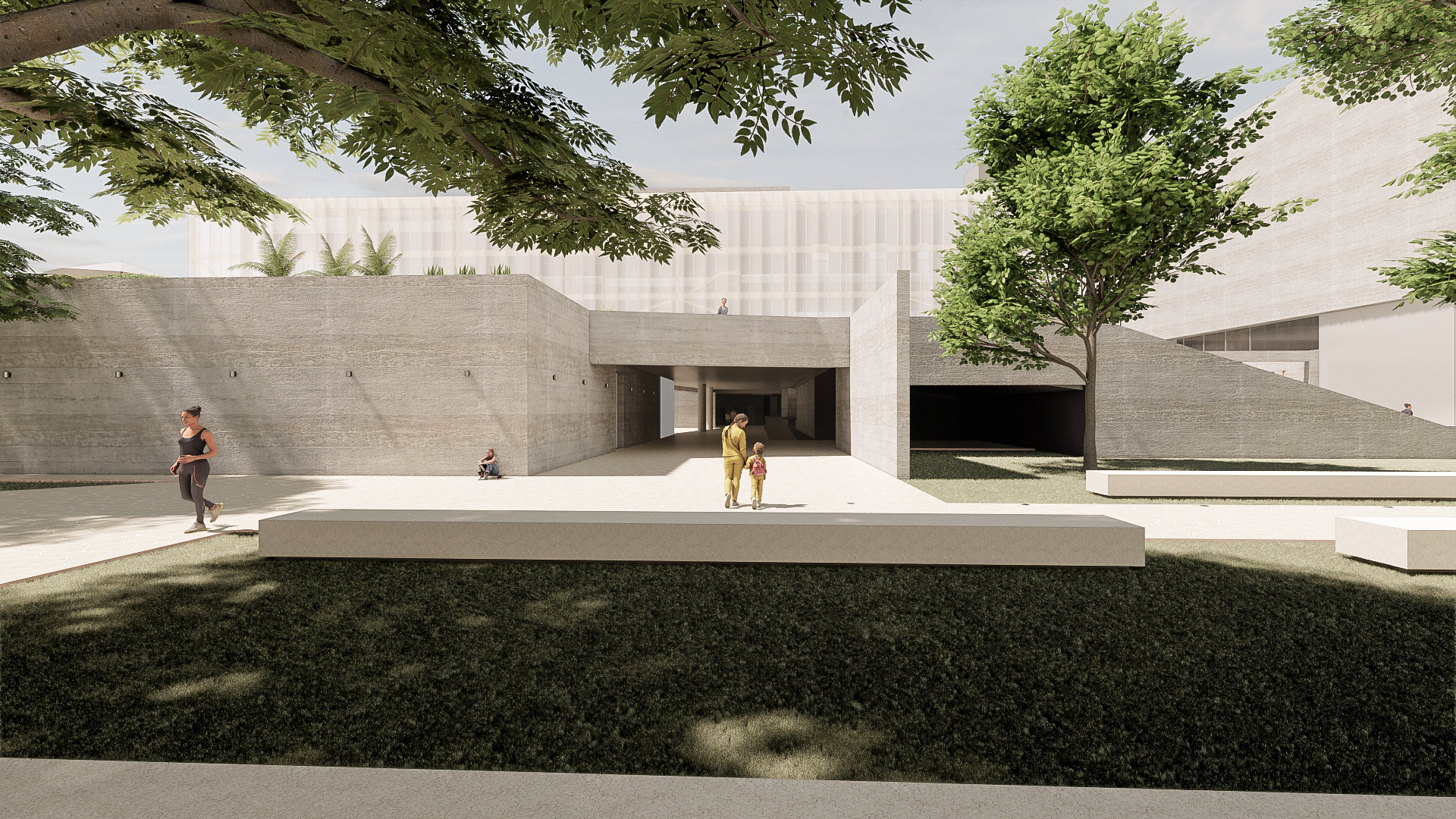 O desafio e o prazer de projetar edifícios vai além das complexidades imanentes do objeto arquitetônico. Pensar um edifício qualquer, sobretudo esta nova unidade SESC, é um dos modos mais importantes e pertinentes de se fazer cidade, revelando a natureza urbana dos edifícios institucionais da urbe. Neste sentido que a interpretação do programa procura salientar condições cotidianas dessa vital relação entre a parte e o todo, estimulando singelos discursos de uma urbanidade no nível cotidiano das apropriações do espaço do edifício. Como da transição suave entre o público e privado no acesso ao edifício, estimulando a presença de uma fachada ativa robusta, criando uma dinâmica visual que permite explorar perspectivas do lote para com a cidade. O cotidiano se descortina, interna e externamente, a partir do envelopamento translúcido do volume, sem a necessidade de uma ruptura abrupta entre as partes, denotando a fluidez interna da proposta e o convite do caminhar para o usuário. A cota 754 é a base do acesso do público. Grande parte do programa social e operacional é organizado a partir do eixo monolítico do edifício. A entrada reserva um espaço amplo e contínuo entre hall de acesso, loja, atendimento e convivência até a comedoria, reservada aos fundos do piso, de fronte às piscinas e à vista interna do lote. Nos pisos acima encontram-se os espaços mais reservados ao silêncio como a biblioteca, salas múltiplos usos, espaço de exposições e a administração. No piso inferior (750) fica toda a parte técnica de serviço, formando um extenso bastidor de funcionamento da unidade. Outro destaque além da face principal é o volume da sala de espetáculos que contrasta com a translucidez da pele perpendicular a sua robustez do concreto aparente. Esta peça concentra os olhares da unidade com a possibilidade de abertura daquela “rocha” para o exterior, promovendo apresentações diversas para o público. No restante do lote, os programas esportivos espalham-se no grande platô central, tendo as quadras cobertas como pano de fundo.