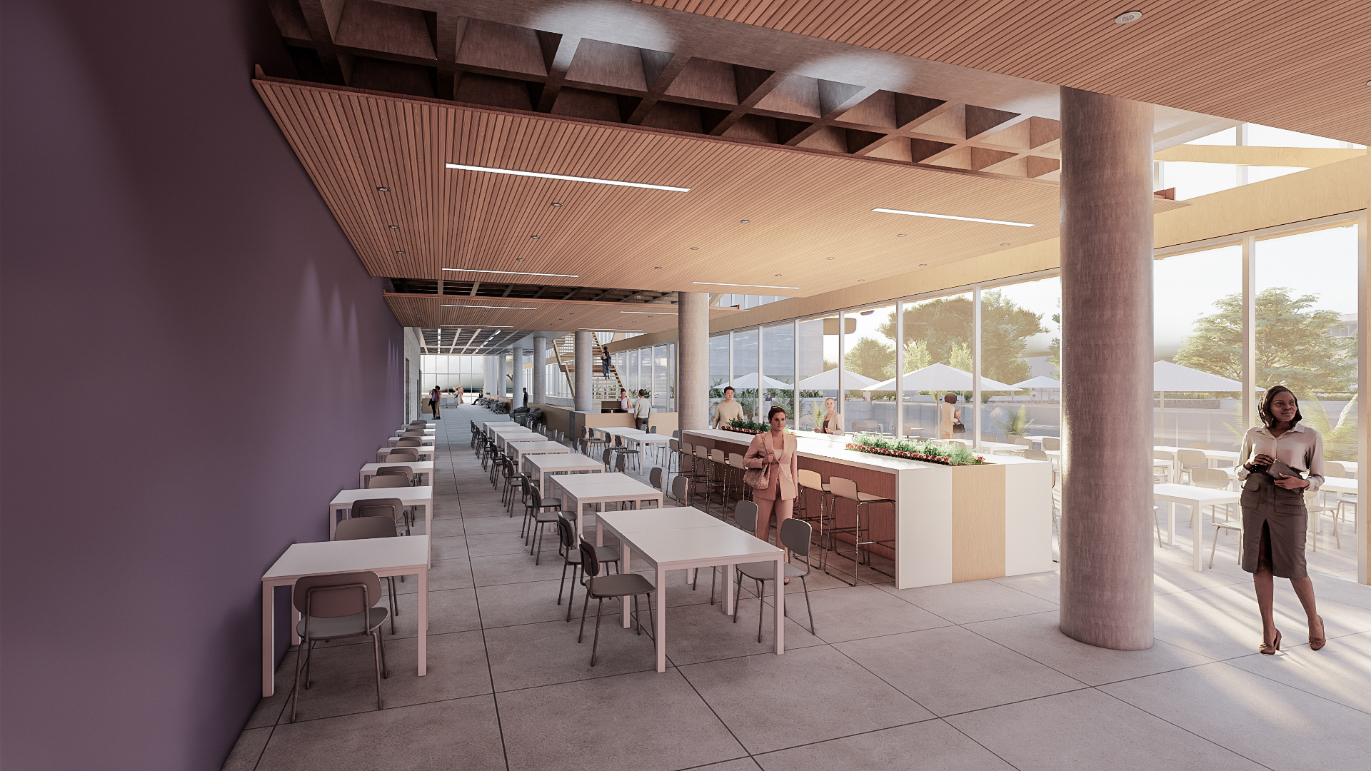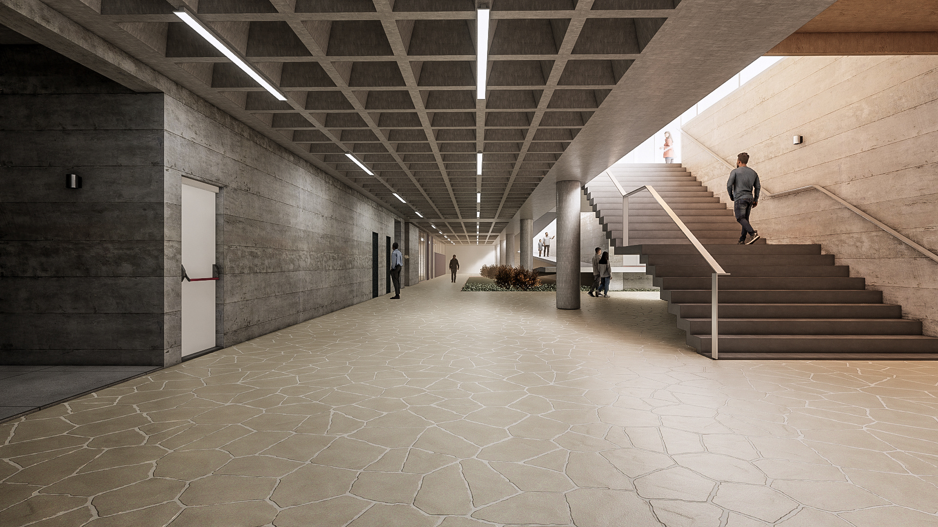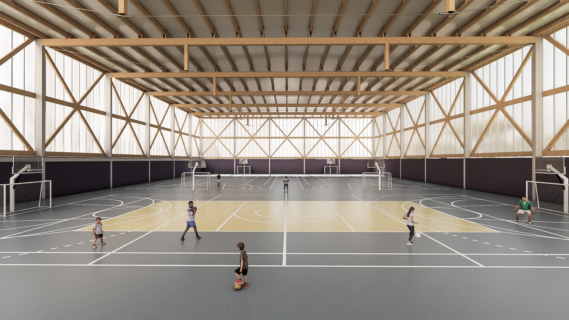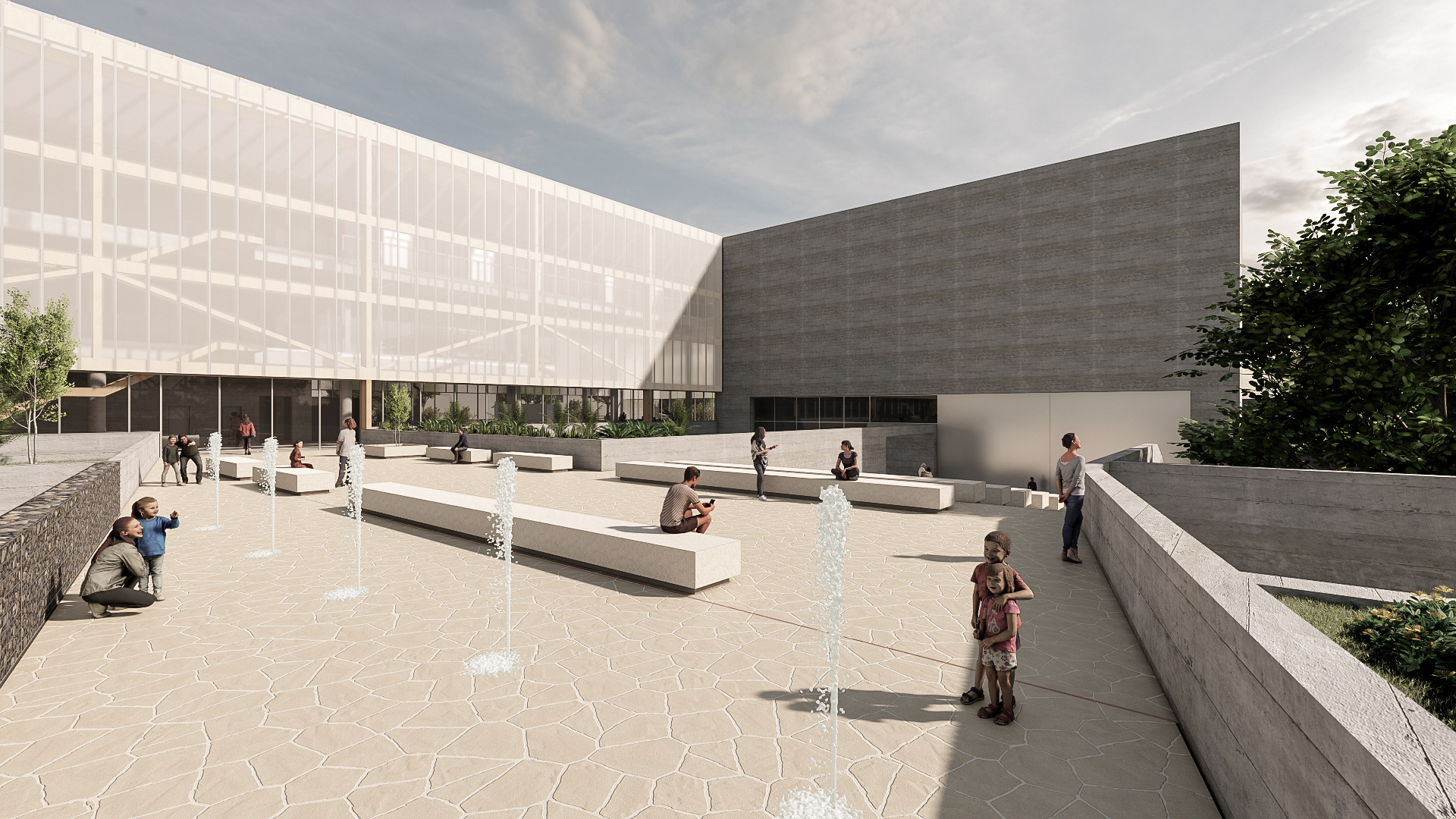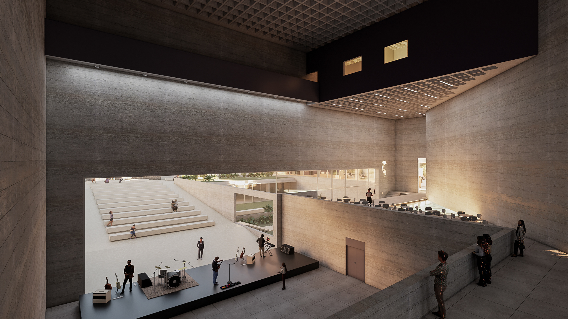 O desafio e o prazer de projetar edifícios vai além das complexidades imanentes do objeto arquitetônico. Pensar um edifício qualquer, sobretudo esta nova unidade SESC, é um dos modos mais importantes e pertinentes de se fazer cidade, revelando a natureza urbana dos edifícios institucionais da urbe. Neste sentido que a interpretação do programa procura salientar condições cotidianas dessa vital relação entre a parte e o todo, estimulando singelos discursos de uma urbanidade no nível cotidiano das apropriações do espaço do edifício. Como da transição suave entre o público e privado no acesso ao edifício, estimulando a presença de uma fachada ativa robusta, criando uma dinâmica visual que permite explorar perspectivas do lote para com a cidade. O cotidiano se descortina, interna e externamente, a partir do envelopamento translúcido do volume, sem a necessidade de uma ruptura abrupta entre as partes, denotando a fluidez interna da proposta e o convite do caminhar para o usuário. A cota 754 é a base do acesso do público. Grande parte do programa social e operacional é organizado a partir do eixo monolítico do edifício. A entrada reserva um espaço amplo e contínuo entre hall de acesso, loja, atendimento e convivência até a comedoria, reservada aos fundos do piso, de fronte às piscinas e à vista interna do lote. Nos pisos acima encontram-se os espaços mais reservados ao silêncio como a biblioteca, salas múltiplos usos, espaço de exposições e a administração. No piso inferior (750) fica toda a parte técnica de serviço, formando um extenso bastidor de funcionamento da unidade. Outro destaque além da face principal é o volume da sala de espetáculos que contrasta com a translucidez da pele perpendicular a sua robustez do concreto aparente. Esta peça concentra os olhares da unidade com a possibilidade de abertura daquela “rocha” para o exterior, promovendo apresentações diversas para o público. No restante do lote, os programas esportivos espalham-se no grande platô central, tendo as quadras cobertas como pano de fundo.