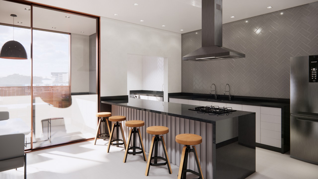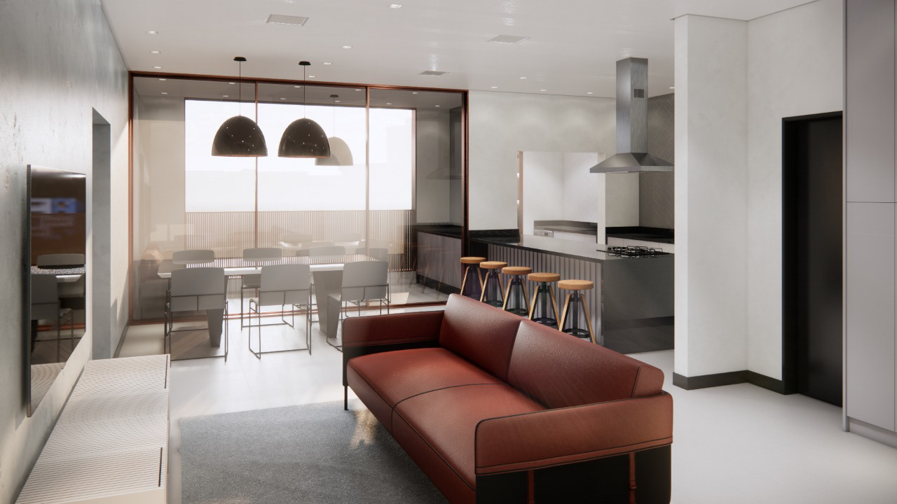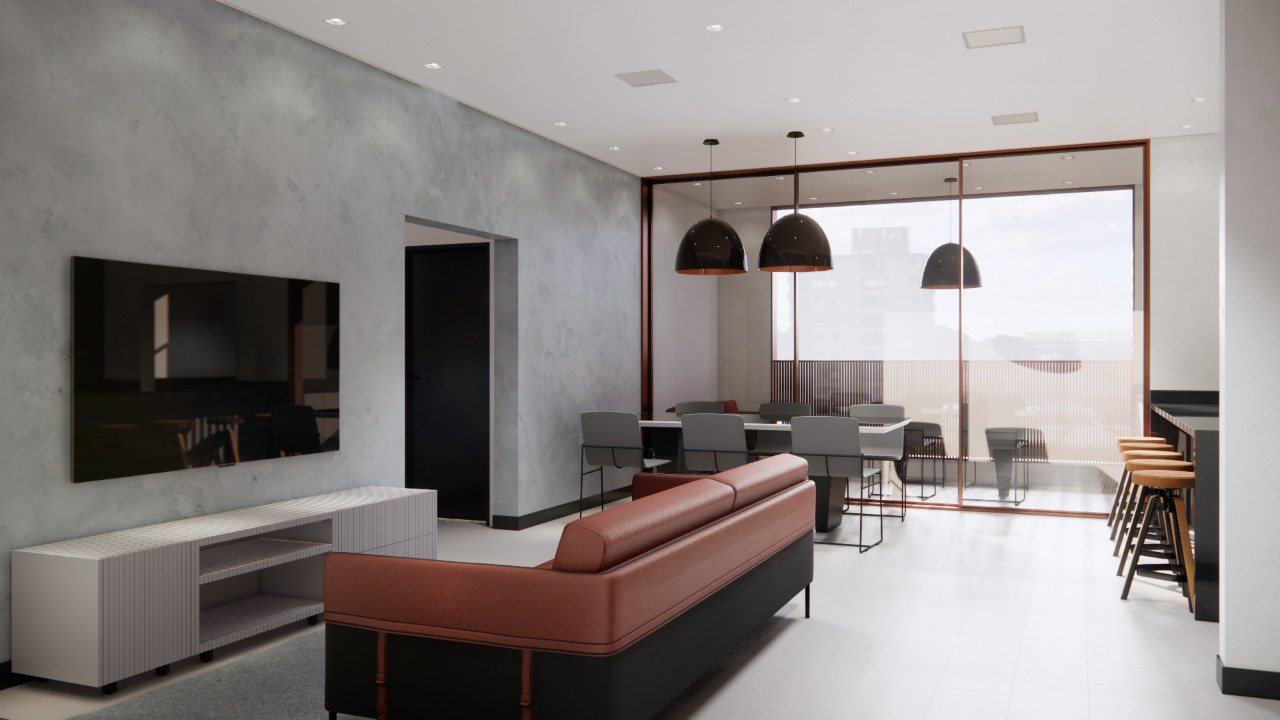 As áreas comuns do edifício se localizam nos pavimentos de acesso. Em conjunto com o hall de entrada, os programas da academia, brinquedoteca, sala multiuso condominial e um espaço para coworking (este programa alinhado com as necessidades atuais de trabalho, garante uma proposta inovadora e antenada para novos tempos).