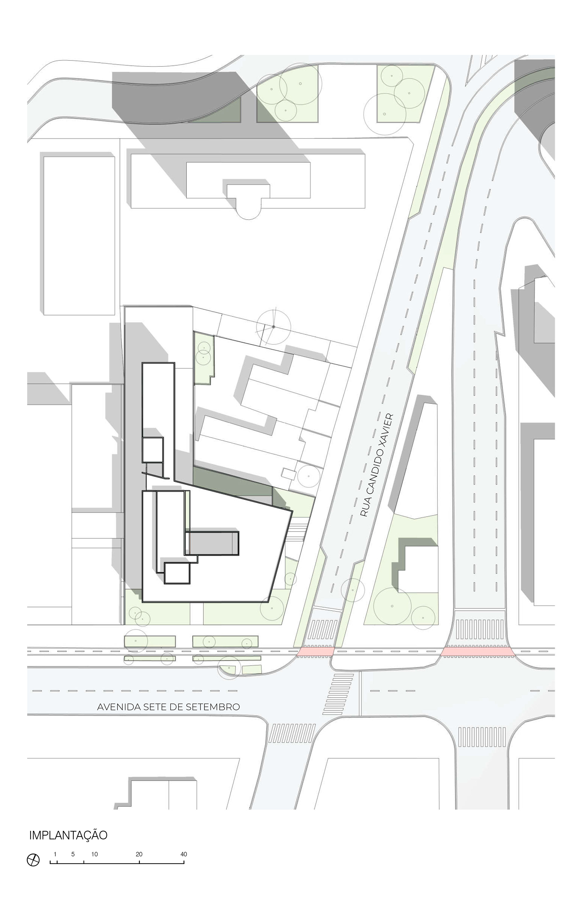 Diante da escala do edifício, de seu corpo exuberante fruto das limitações do lote e das exigências legislativas e programáticas, procura-se sobressair um desenho limpo, revelador das partes componentes da edificação, dando ênfase ao bloco total e as linhas ritmadas das aberturas.