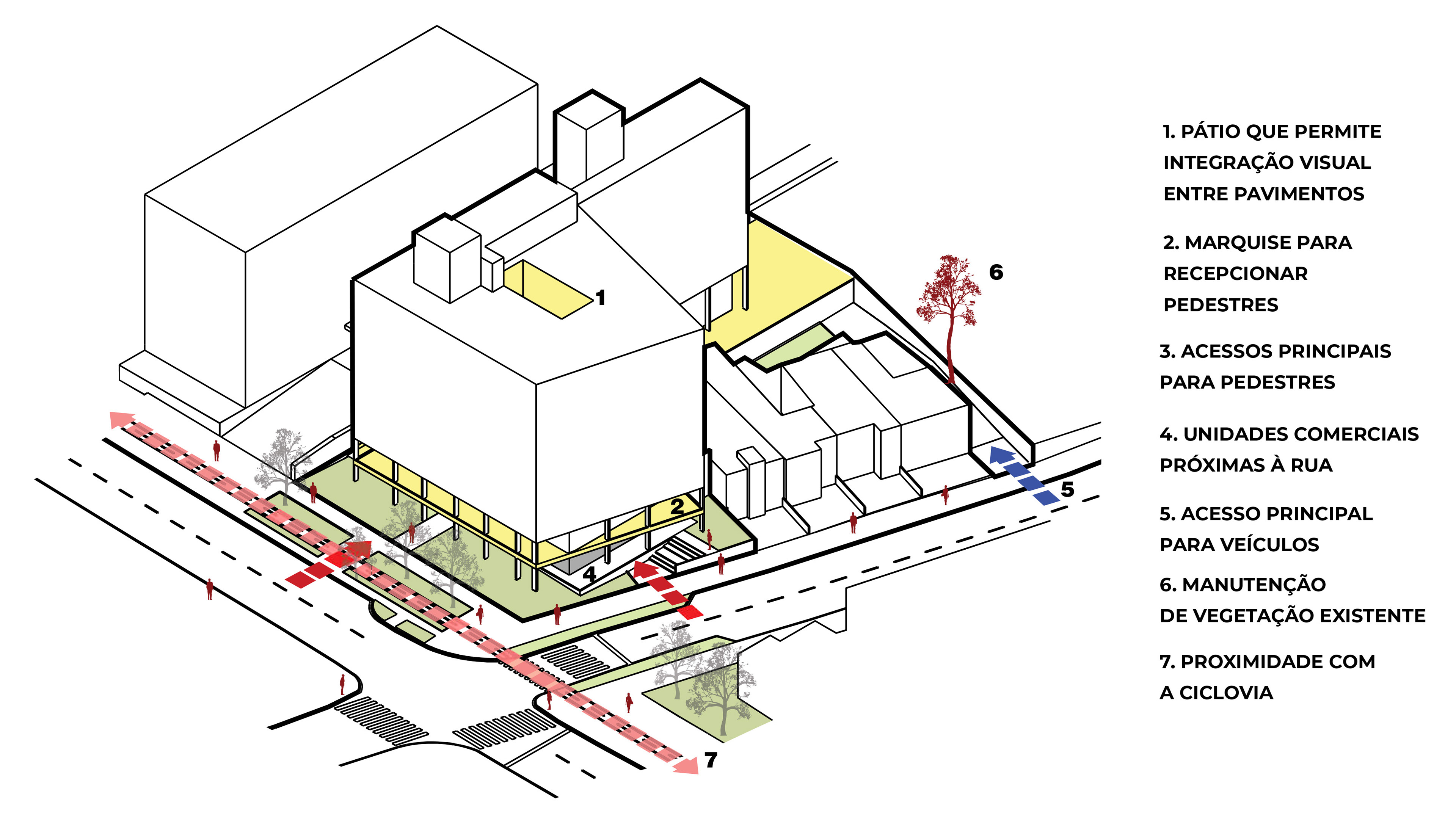 Estes destaques do projeto fazem parte das diretrizes de nossa proposta. A ideia de uma bairro mais colaborativo e saudável encontra nesses espaços um gesto de gentileza urbana, de estímulo e acolhimento, como exemplo possível de encararmos uma saudável relação espacial entre o público e o privado.