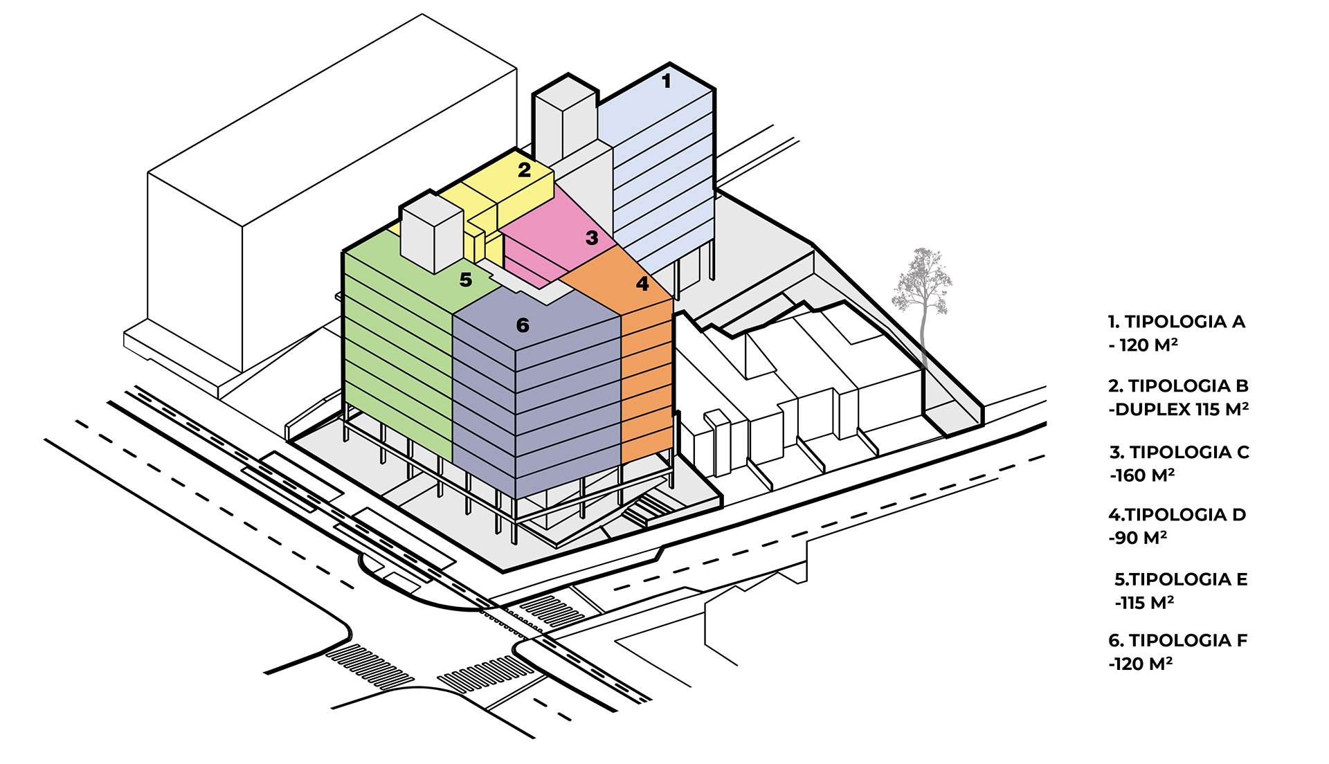 Esta introdução aponta o partido arquitetônico dessa proposta, somado aos valores que o próprio edital do concurso emula. A oportunidade de se fazer cidade olhando dentro dela. Assim, a responsabilidade do arquiteto e do incorporador não pode passar ao largo da natureza urbana dos edifícios. Neste sentido que a interpretação do programa procura salientar condições cotidianas dessa vital relação entre a parte e o todo, estimulando singelos discursos como da transição suave entre o público e privado no acesso ao edifício; a dinâmica visual que permite explorar perspectivas da cidade, como indica o trabalho das fachadas, todas elas diferentes entre si de acordo com cada tipologia das unidades habitacionais; e, ainda, o uso comercial na base do edifício, estimulando um uso fundamental à vida na cidade, conformando junto ao uso residencial um bloco homogêneo. Ali, o cotidiano se descortina, interna e externamente, sem a necessidade de uma ruptura abrupta entre as partes, continuando o legado de um bairro multifuncional e diverso.