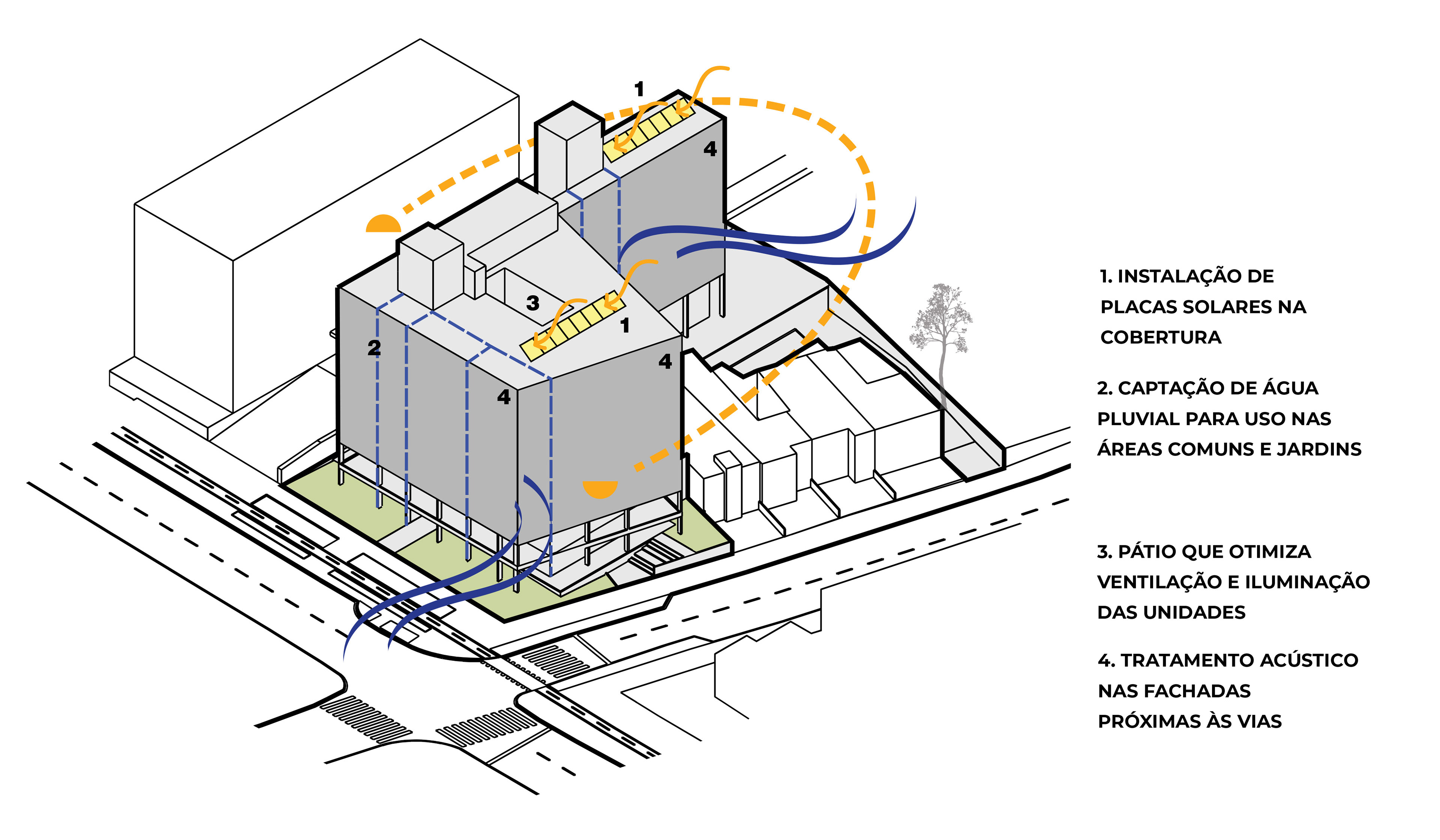 A proposta segue as tendências mais atuais sobre eficiência dos recursos materiais disponíveis em mercado. O complexo será atendido por soluções de energia solar, aproveitando o amplo espaço para locação das placas no ático; medidas de redução de consumo de água, ao prever a instalação de cisternas nos jardins do empreendimento conectadas aos pontos coletores das águas pluviais localizadas na cobertura da torre e no nível térreo. As aberturas ao exterior estrategicamente locadas de acordo com o layout de cada apartamento, a presença de um grande fosso de iluminação e ventilação formando um marcante pátio, garantem um eficiente conforto térmico e lumínico. E a especificação de toda a caixilharia visa à eficiência acústica exigida das Normas Brasileiras.