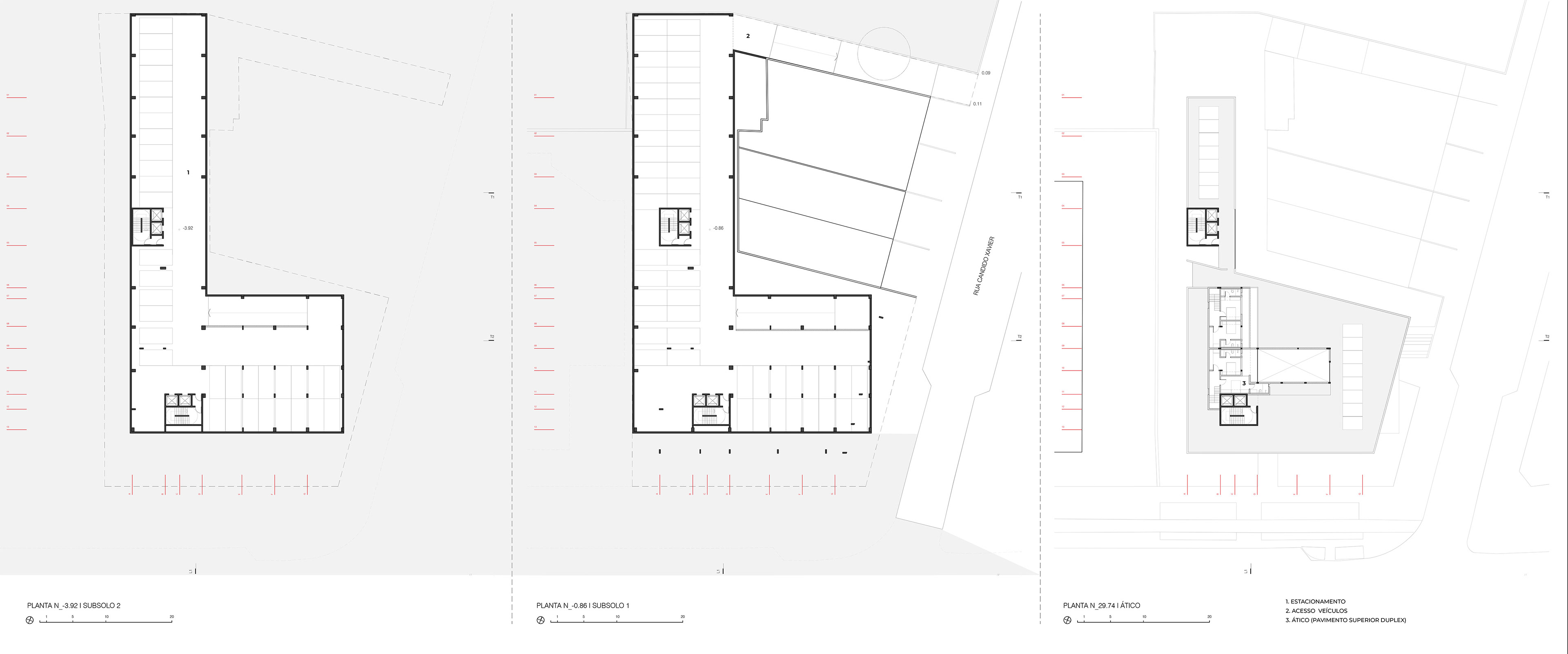 O controle de acesso se restringe ao amplo balcão disposto no hall de entrada. Tal entrada, próxima da esquina, procura valorizar o desenho do espaço público ao entender a sua inserção como continuação do espaço externo. O acesso de veículos lida com uma situação existente nos limites do lote – a rua interna que abriga uma linda araucária permanece (quase toda ela permeável), tendo um uso exclusivo para os veículos do edifício.